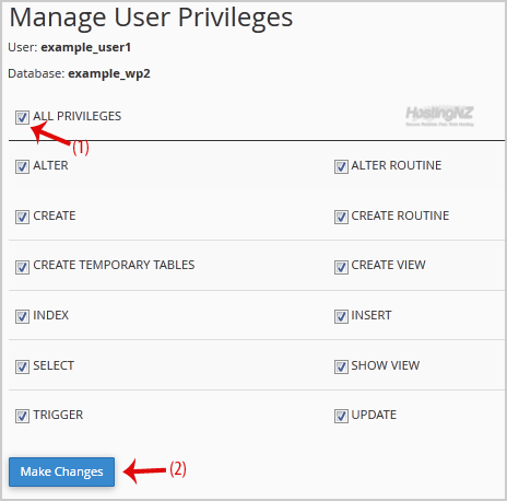 5. On Manage User Privileges, mark the box ALL PRIVILEGES and click on Make Changes.