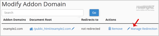 3. Under Modify Addon Domain, locate the add-on domain and click on Manage Redirection.