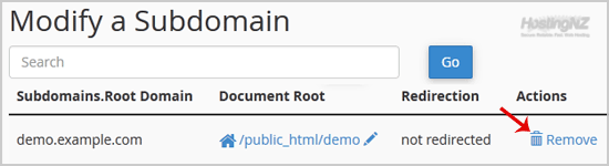 5. You will receive a warning that you are removing a subdomain.example.com. You will need to click on the Delete Subdomain button to remove your subdomain permanently.