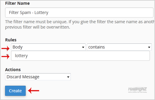 6. In the filter rules, you can filter email with many options, and should you want to deal with email, which contains a word like Lottery or other words, then in the first list box select Body and select Contains in the second list box.