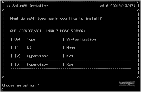 Step 2: It will show you an option to choose virtualization. Most people prefer KVM or Xen. Select your preferred virtualization by typing 1 or 2 and then press Enter. For KVM, we enter 2 and then hit Enter.